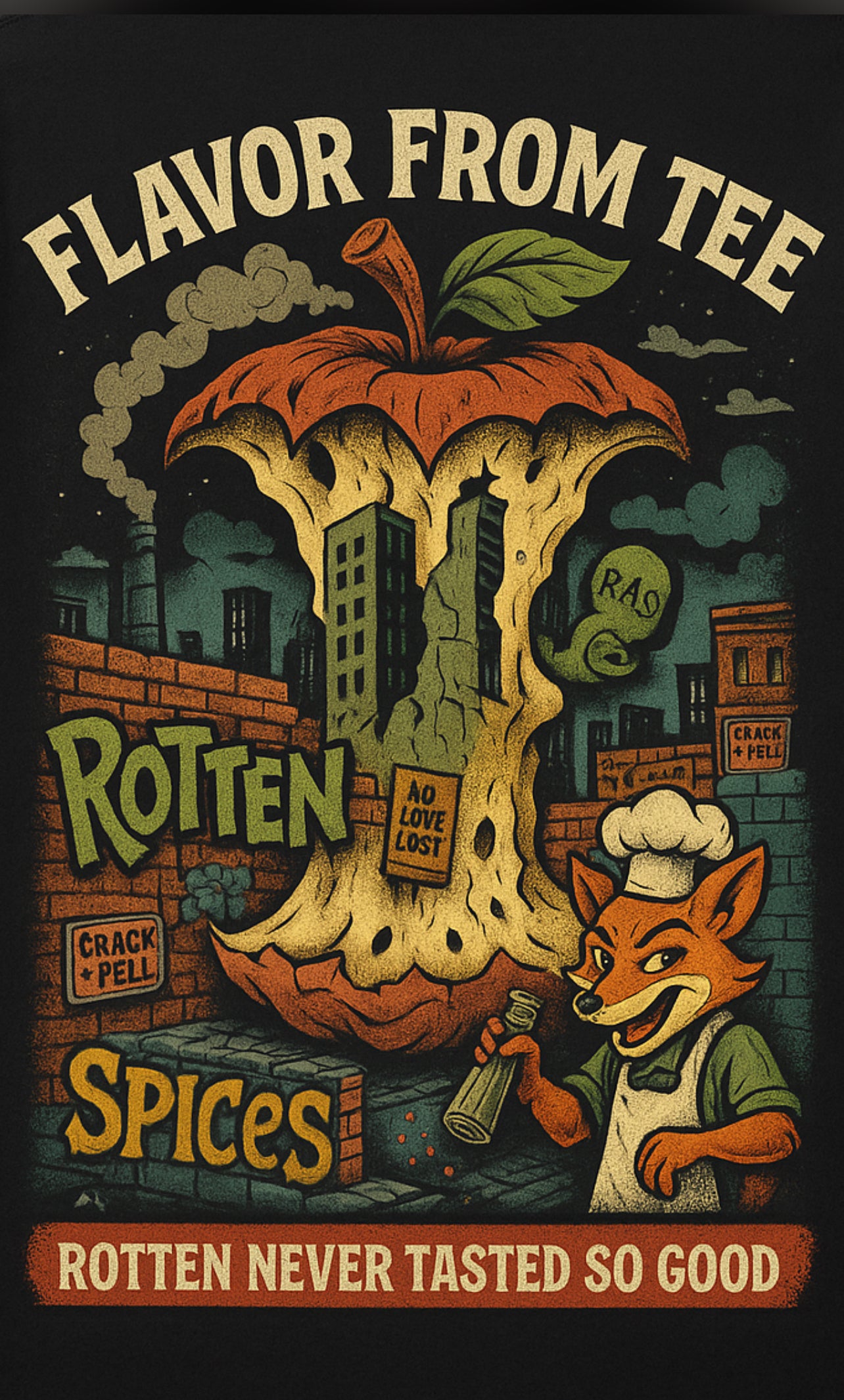Bring the streets to the kitchen with this gritty Rotten Apple Spices design. The bold graphic features a rotting apple core skyline, crumbling bricks, and the sly Chef Fox serving up spice with attitude. From “5 Borough Blend” to “SoHo Blend” every detail drips with flavor and urban grit. Topped off with our unapologetic tagline—“Rotten Never Tasted So Good”—this tee is made for those who cook loud, live bold, and never play bland.